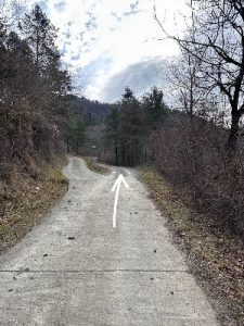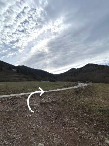 Una vez cruzado el puente, veremos un poste indicando la dirección. Deberemos continuar todo recto siguiendo el camino de al lado del río. En un punto, lo tendremos que cruzar y podremos hacerlo sin problemas gracias a un puente. Seguiremos caminando por al lado del río (en este caso, nos quedará a mano derecha) hasta llegar a un sendero más amplio de tierra que nos conducirá a un camino asfaltado.